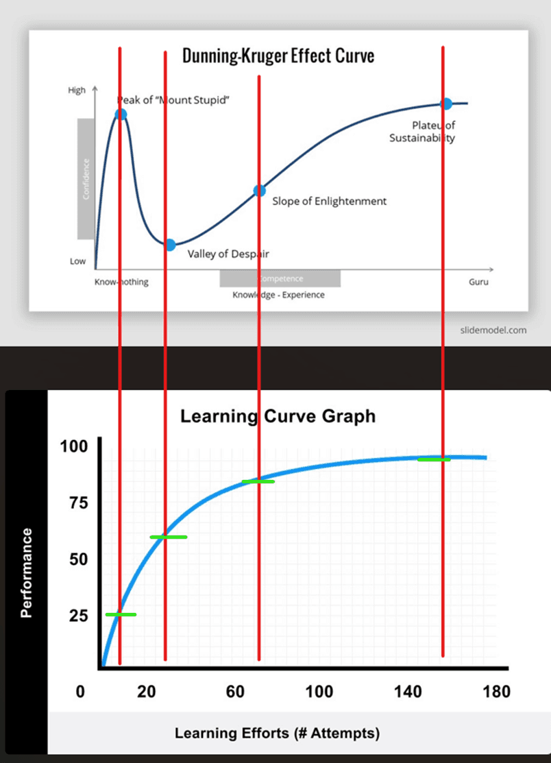 It is worthwhile superseding both curves to have an approximate idea of how confidence relates to knowledge in the context of time, see fig.3, this helps managing expectations; hence, being prepared for fluctuations. Having a look at fig.3 allows one to reflect on personal previous experience.