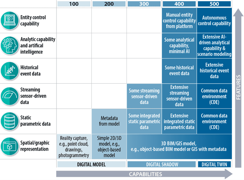 These advantages only scratch the surface of the potential of Digital Twins. Referencing the following chart (figure 1) the industry is currently at the early stages (levels 1-2) of digital twin adoption, with immense potential to progress to advanced stages (levels 3-5). This future vision includes predictive analytics, comprehensive real-time data integration, and autonomous decision-making, which will drive further innovation and efficiency. The adoption of digital twins represents a significant leap forward for the construction sector, promising smarter, more efficient, and sustainable buildings. The future of construction is undeniably digital, with digital twins leading the charge towards a more innovative and effective industry.